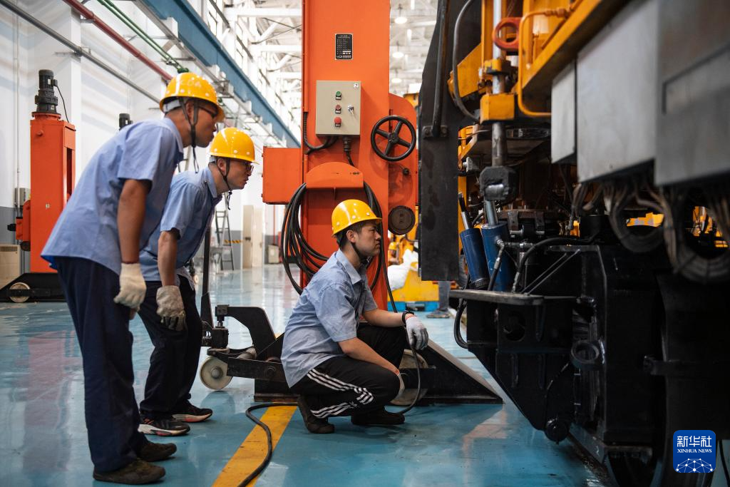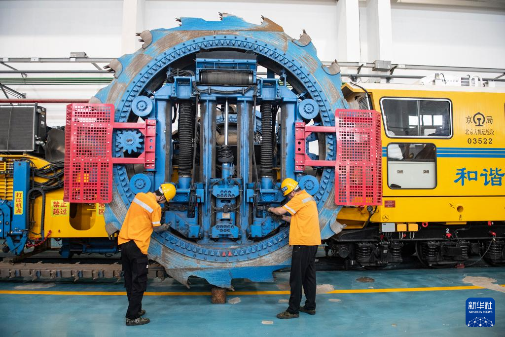 7月25日,在国铁北京局北京大型养路机械运用检修段的检修库,职工们对大型养路机械开展检修工作。