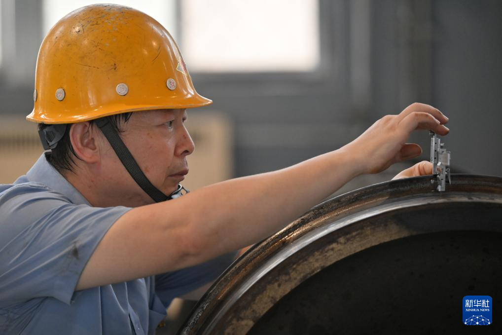 7月25日,在国铁北京局北京大型养路机械运用检修段的检修库,职工在测量轮对数据。
