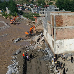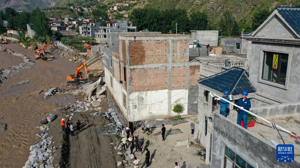 7月25日,在甘肃省陇南市武都区三河镇竹林村,电力员工为道路抢修安装应急照明灯(无人机照片)。