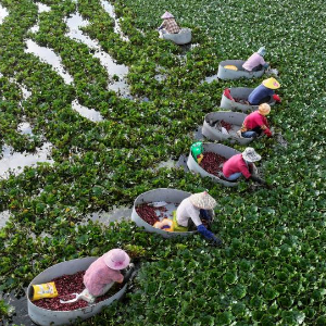 7月25日,在江苏省淮安市洪泽区岔河镇,农民采摘菱角(无人机照片)。