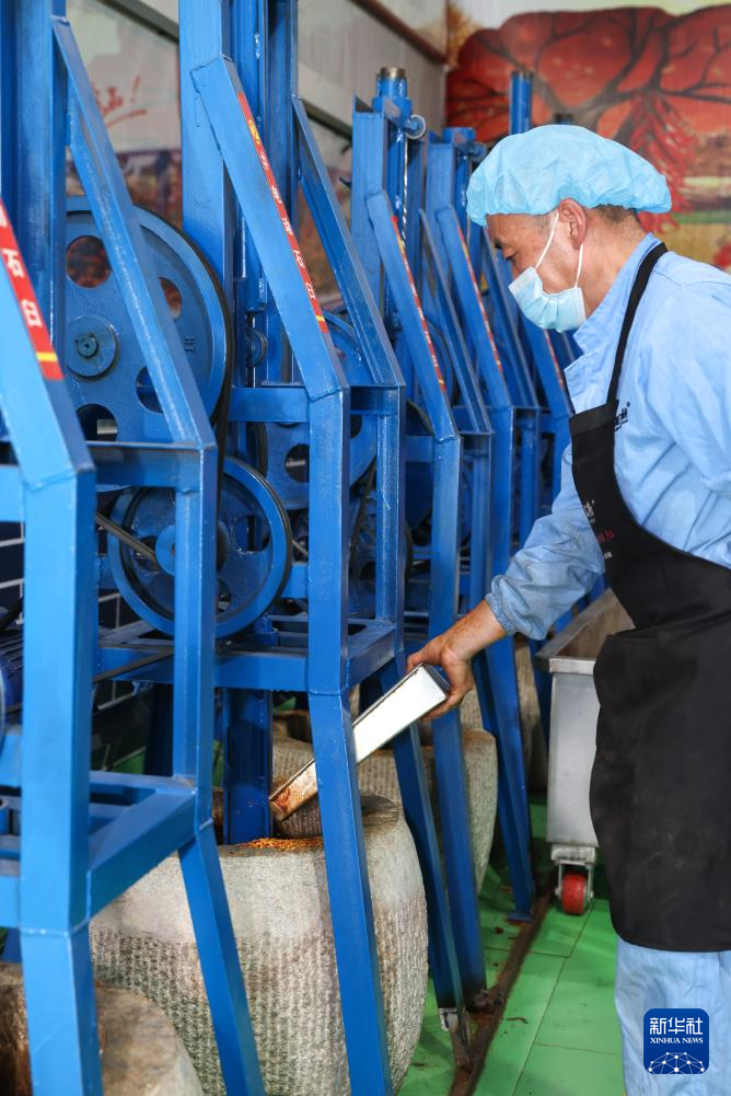 7月22日,在天水市甘谷县安远镇大城村的一家农业科技企业,工人用电动石碾加工辣椒面。