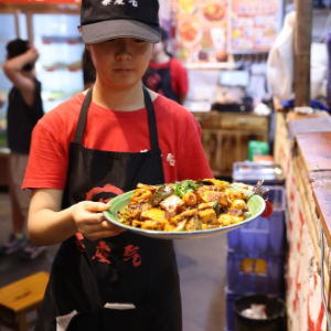 7月22日,工作人员在甘肃天水古城的一家麻辣烫店里上菜。