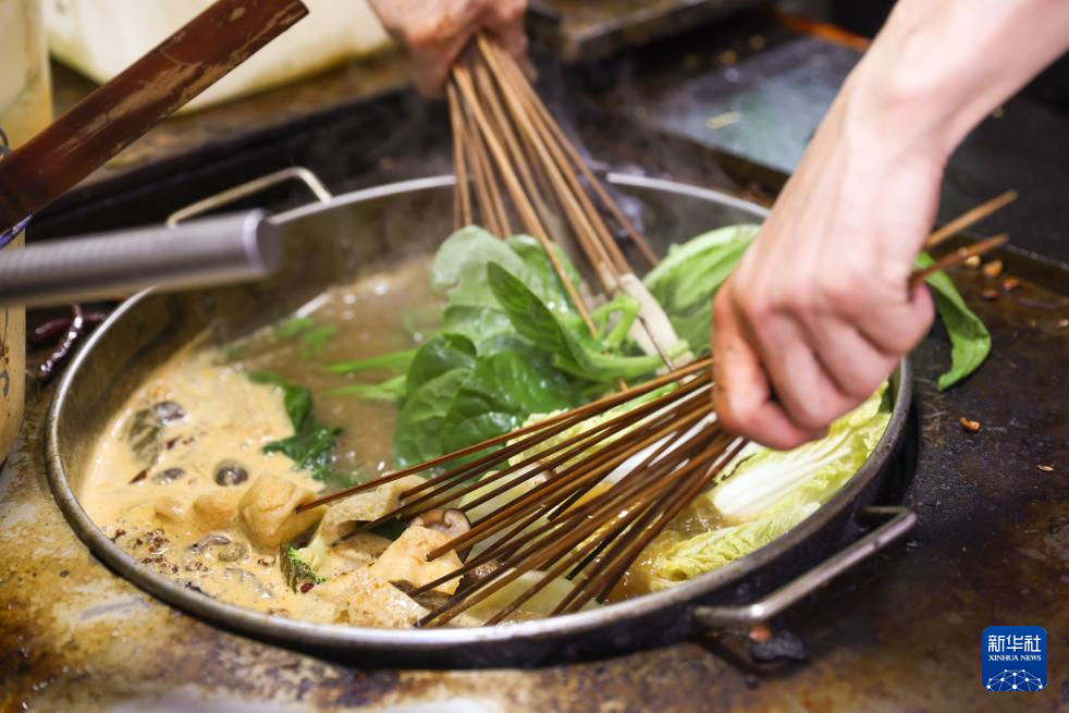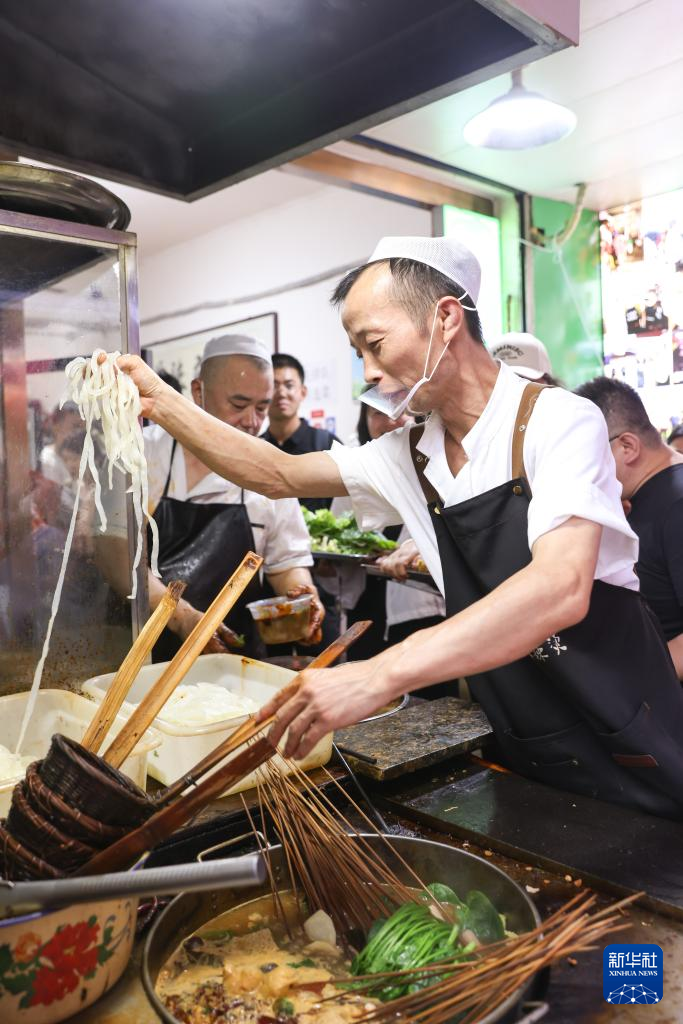 7月22日,在天水市秦州区天水古城内的一家麻辣烫店,店员制作天水麻辣烫。