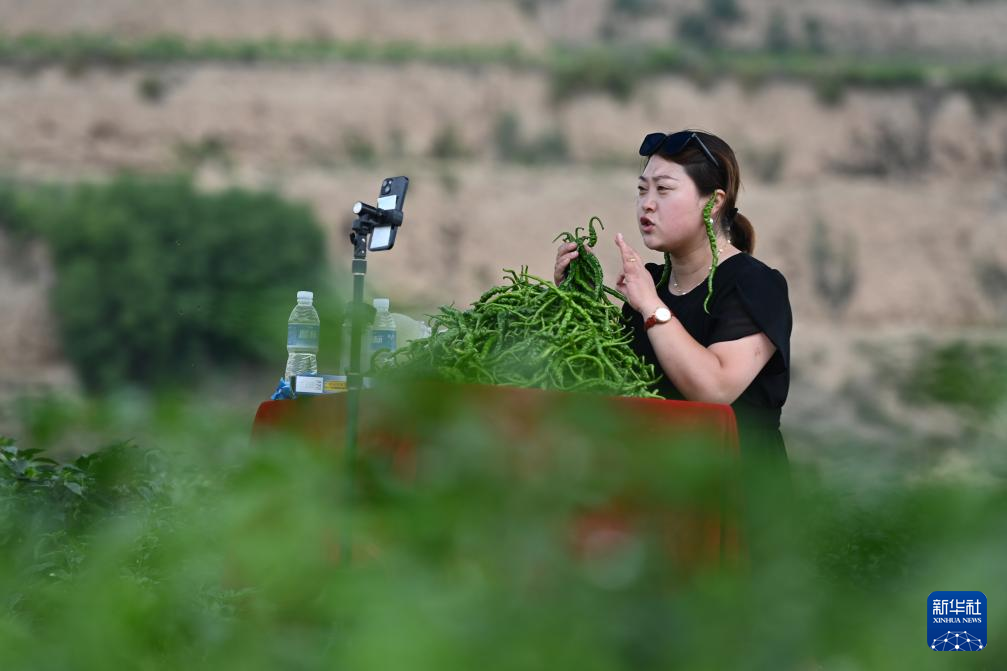 7月22日,在天水市甘谷县新兴镇侯家沟村的辣椒生产基地,工作人员直播销售辣椒。