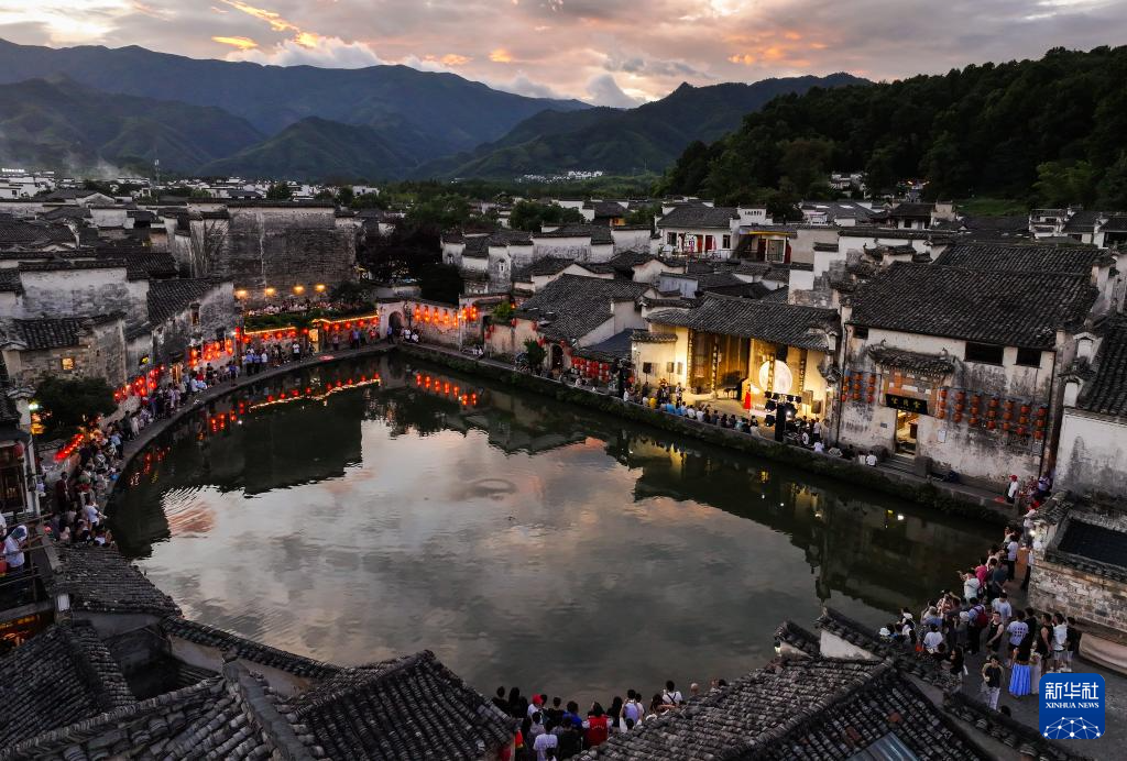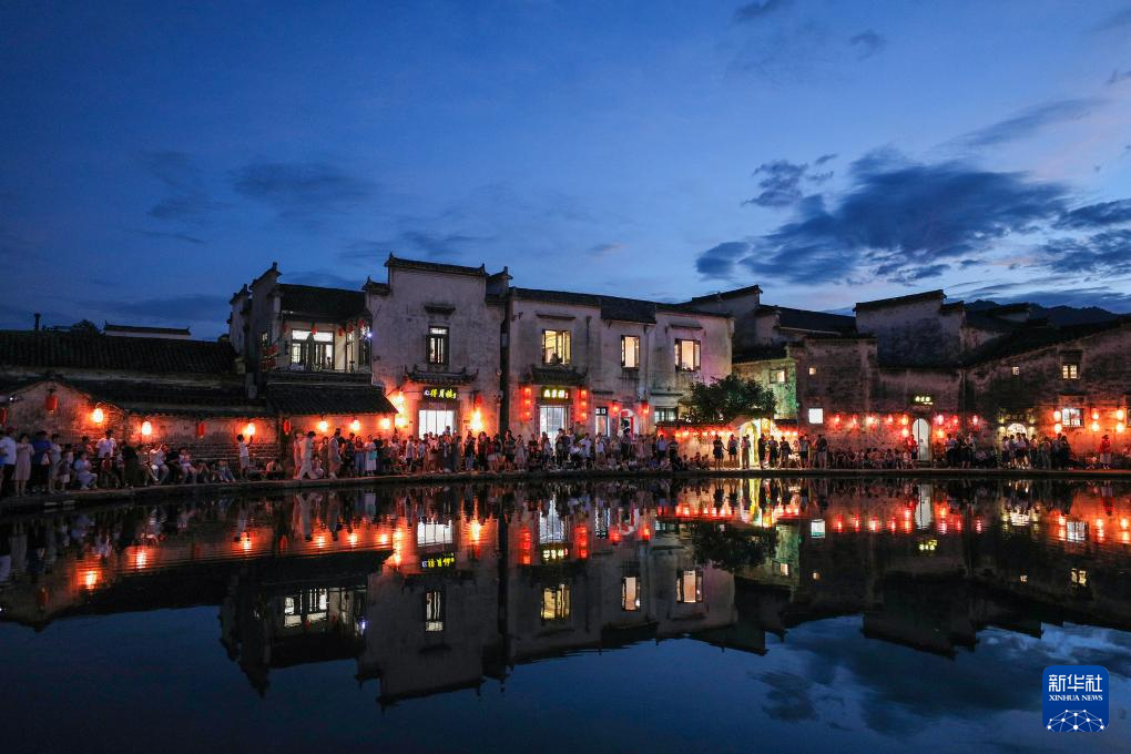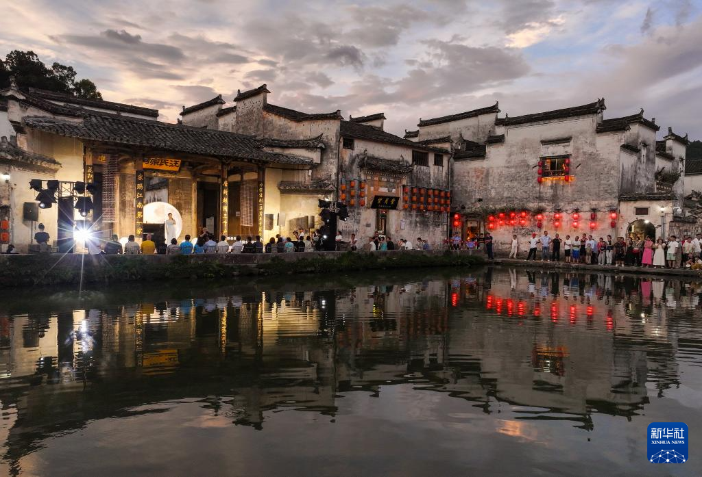 7月25日晚,游客在黄山市黟县宏村月沼旁欣赏音乐会表演。