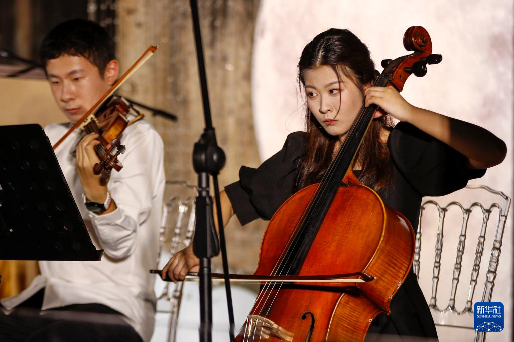7月25日晚,中国音乐学院实践团成员在黄山市黟县宏村月沼音乐会上表演。