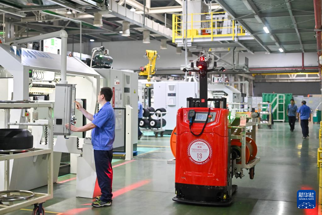 7月26日,无人叉车在杭州中策钱塘实业有限公司轮胎数字工厂车间内装运物料。