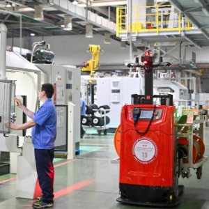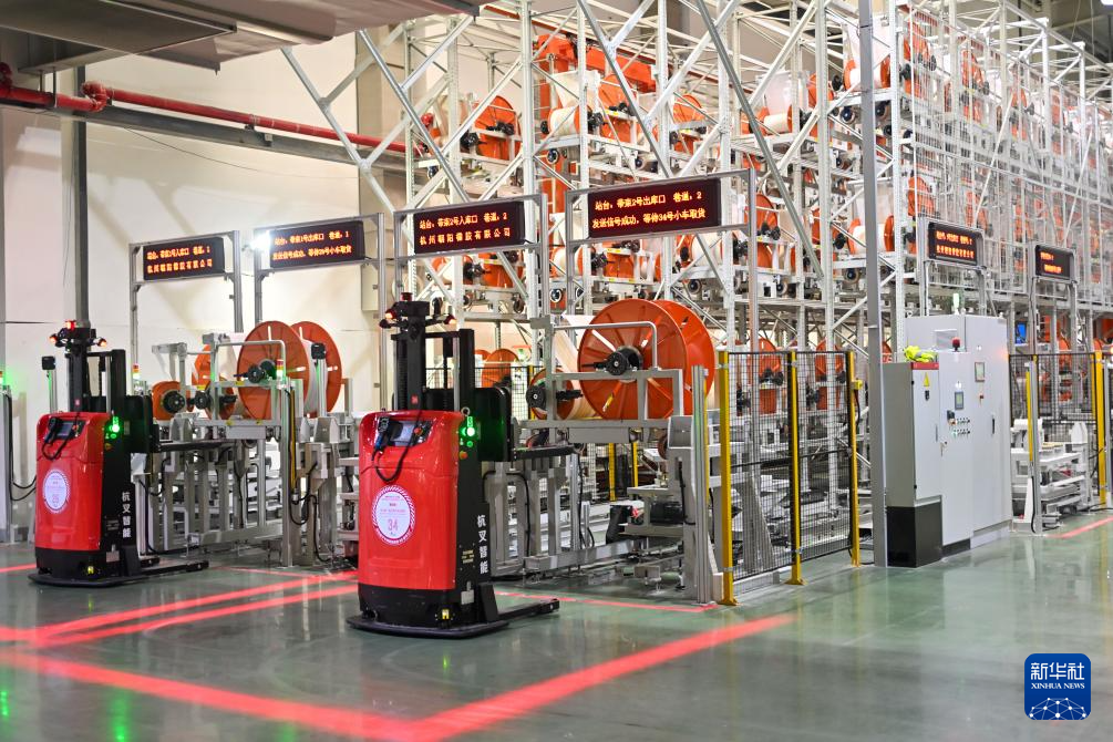7月26日,无人叉车在杭州中策钱塘实业有限公司轮胎数字工厂车间内行驶。
