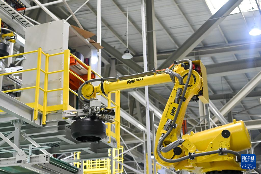在杭州中策钱塘实业有限公司轮胎数字工厂车间,机械臂在运输轮胎半成品(7月26日摄)。