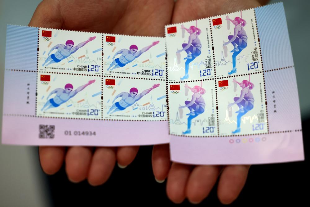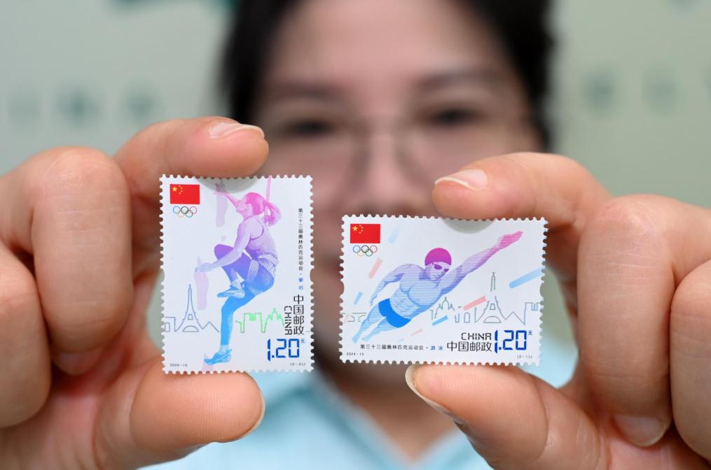 7月26日,中国邮政集团有限公司山东省枣庄市分公司工作人员展示《第三十三届奥林匹克运动会》纪念邮票。