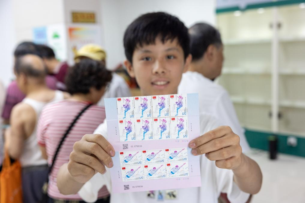 7月26日,中国邮政集团有限公司四川省内江市东兴区分公司工作人员展示《第三十三届奥林匹克运动会》纪念邮票。