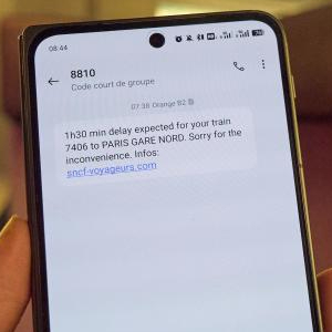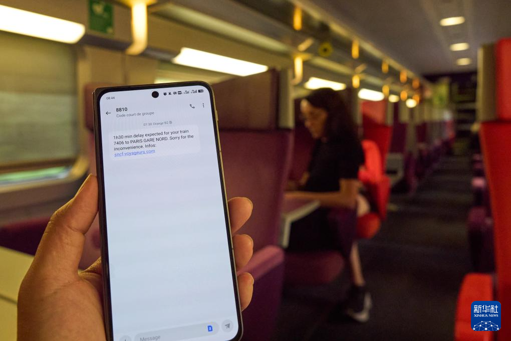这是7月26日在法国里尔至巴黎的火车上拍摄的列车延误通知短信。