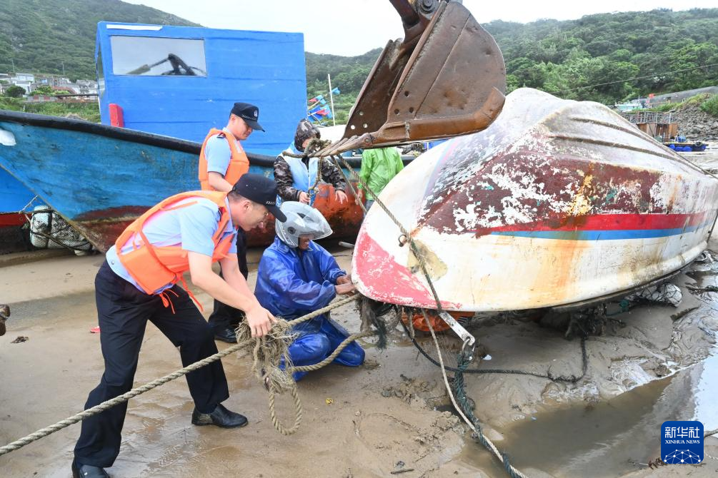 7月26日,福建省平潭综合实验区君山镇渔屿村干部以及平潭综合实验区公安局君山支队民警在码头前帮助村民整理被台风掀翻的船舶。