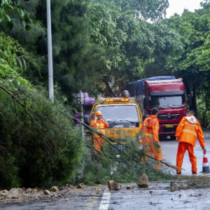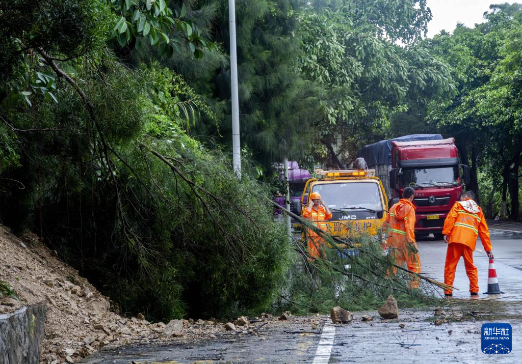 7月26日,在福州长乐区一处公路边,部分路段受台风影响导致滑坡,树木倒伏路面影响车辆运行,工作人员进行紧急抢修。