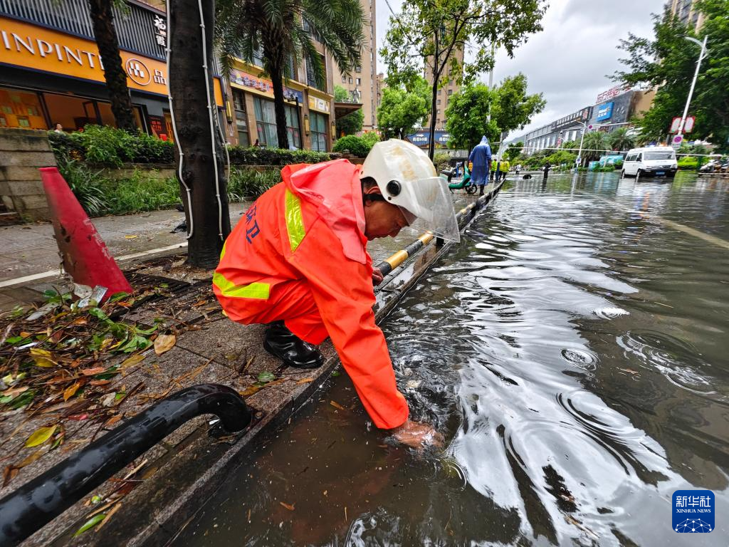 7月26日,福建省宁德市霞浦县一名环卫工人在疏通积水路段的排水孔。