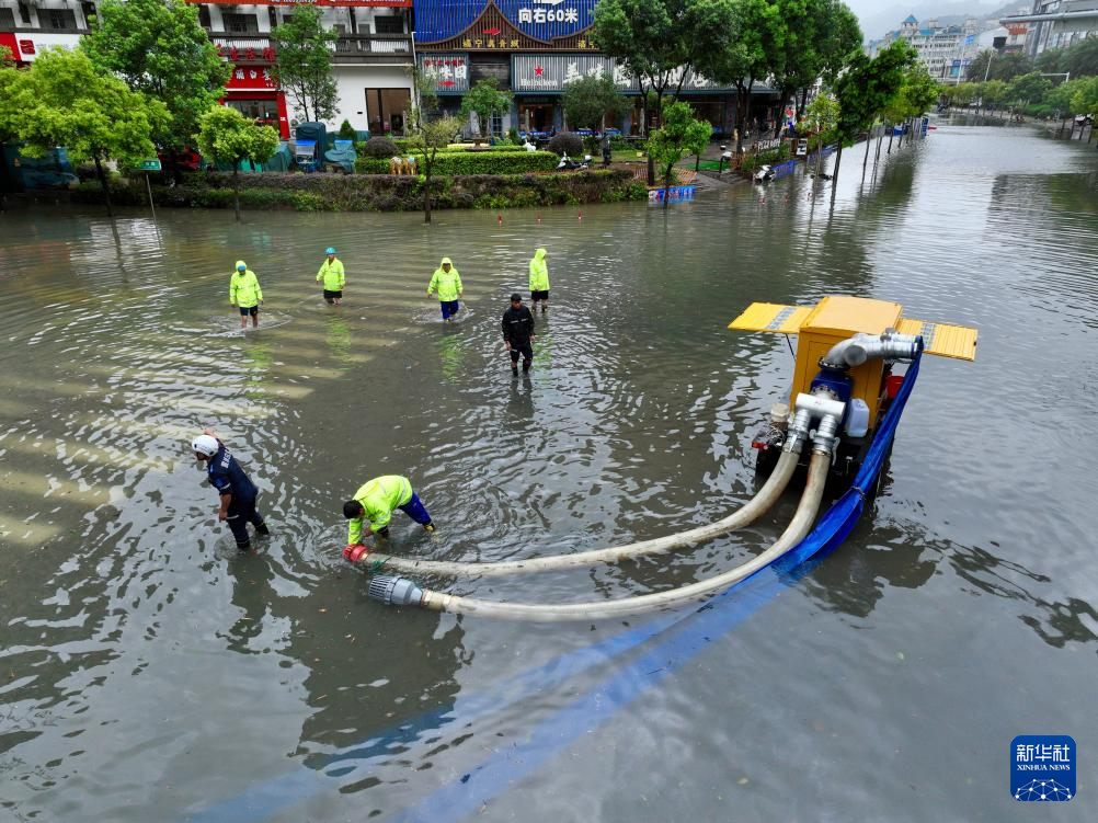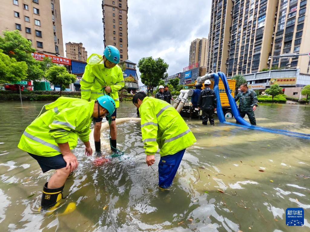 7月26日,福建省宁德市霞浦县抢险救援人员在城区积水路段进行排涝作业。