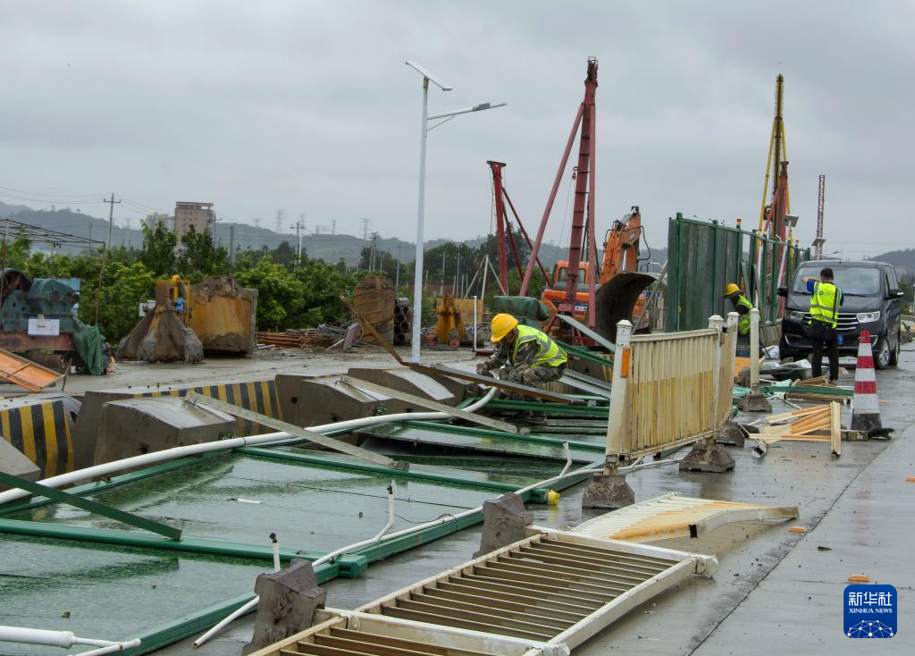 7月26日,在福州长乐闽江河口国家湿地公园附近一处工地,工作人员抢修被台风刮倒的工地围挡。