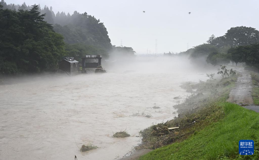 这是7月26日在日本山形县酒田市拍摄的水位上涨的河流。