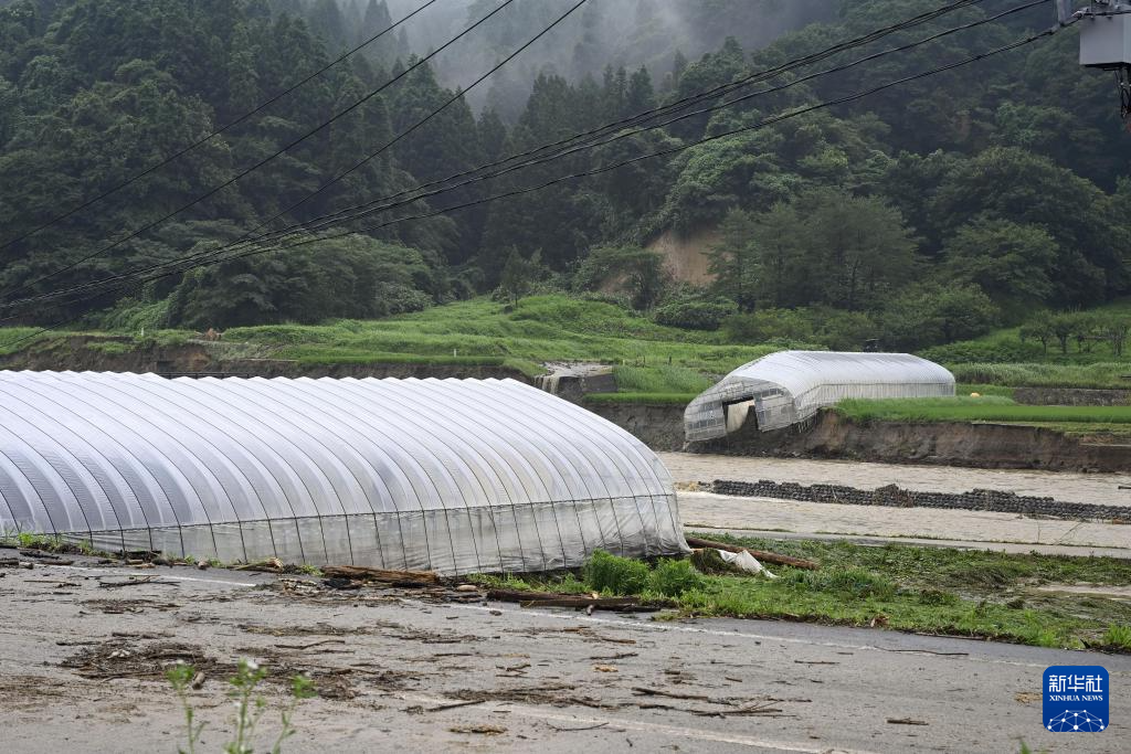 这是7月26日在日本山形县酒田市拍摄的被洪水摧毁的大棚。