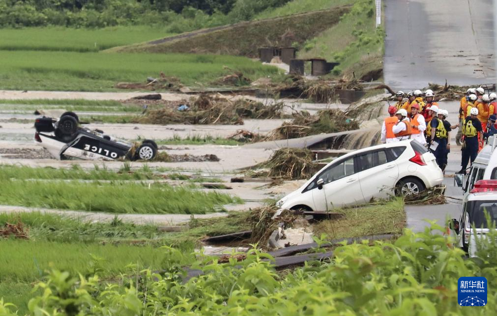 这是7月26日在日本山形县新庄市拍摄的被洪水冲走的车辆。