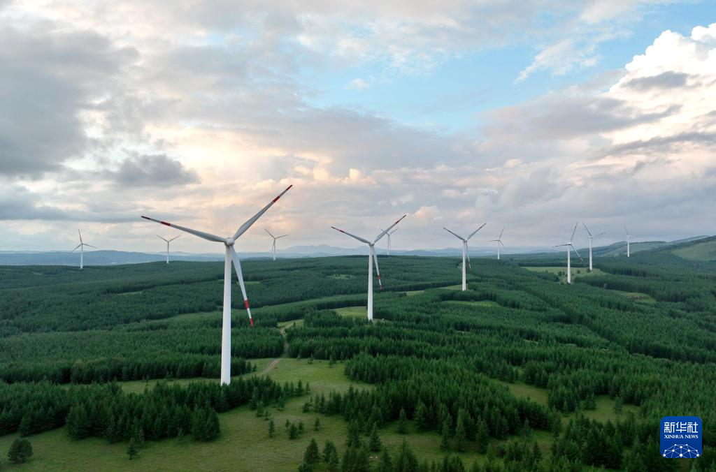 7月25日拍摄的河北省围场满族蒙古族自治县御道口镇附近的风电场景色(无人机照片)。