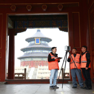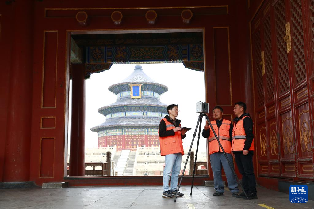 北京市测绘设计研究院团队在天坛进行测绘(2023年4月3日摄)。数字测绘技术为人们认识和保护北京中轴线带来新的可能。2020年9月开始,北京市测绘设计研究院的技术团队,开展了北京中轴线遗产点实地测绘。他们搭建的“实景三维中轴线”,将一条数字孪生版的北京中轴线呈现在世人面前。 数字测绘技术从文物保护、环境整治、文物腾退等方面为北京中轴线申遗提供了高精度、三维立体的空间数据底板。未来,北京市测绘设计研究院团队将持续利用科技手段,助力文化遗产保护。