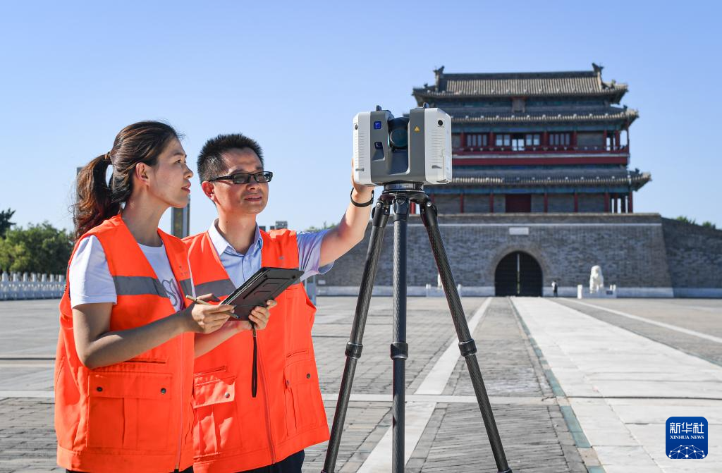 北京市测绘设计研究院团队成员在永定门前作业(7月17日摄)。数字测绘技术为人们认识和保护北京中轴线带来新的可能。2020年9月开始,北京市测绘设计研究院的技术团队,开展了北京中轴线遗产点实地测绘。他们搭建的“实景三维中轴线”,将一条数字孪生版的北京中轴线呈现在世人面前。 数字测绘技术从文物保护、环境整治、文物腾退等方面为北京中轴线申遗提供了高精度、三维立体的空间数据底板。未来,北京市测绘设计研究院团队将持续利用科技手段,助力文化遗产保护。