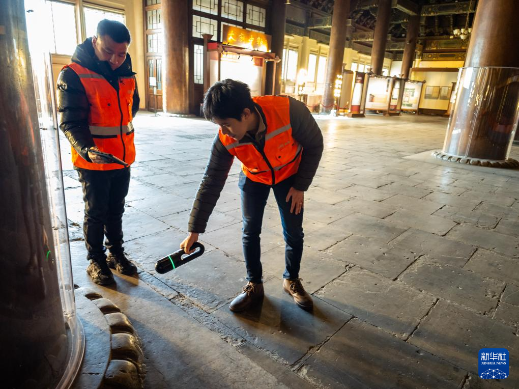 北京市测绘设计研究院团队在太庙进行测绘(2023年2月19日摄)。数字测绘技术为人们认识和保护北京中轴线带来新的可能。2020年9月开始,北京市测绘设计研究院的技术团队,开展了北京中轴线遗产点实地测绘。他们搭建的“实景三维中轴线”,将一条数字孪生版的北京中轴线呈现在世人面前。 数字测绘技术从文物保护、环境整治、文物腾退等方面为北京中轴线申遗提供了高精度、三维立体的空间数据底板。未来,北京市测绘设计研究院团队将持续利用科技手段,助力文化遗产保护。