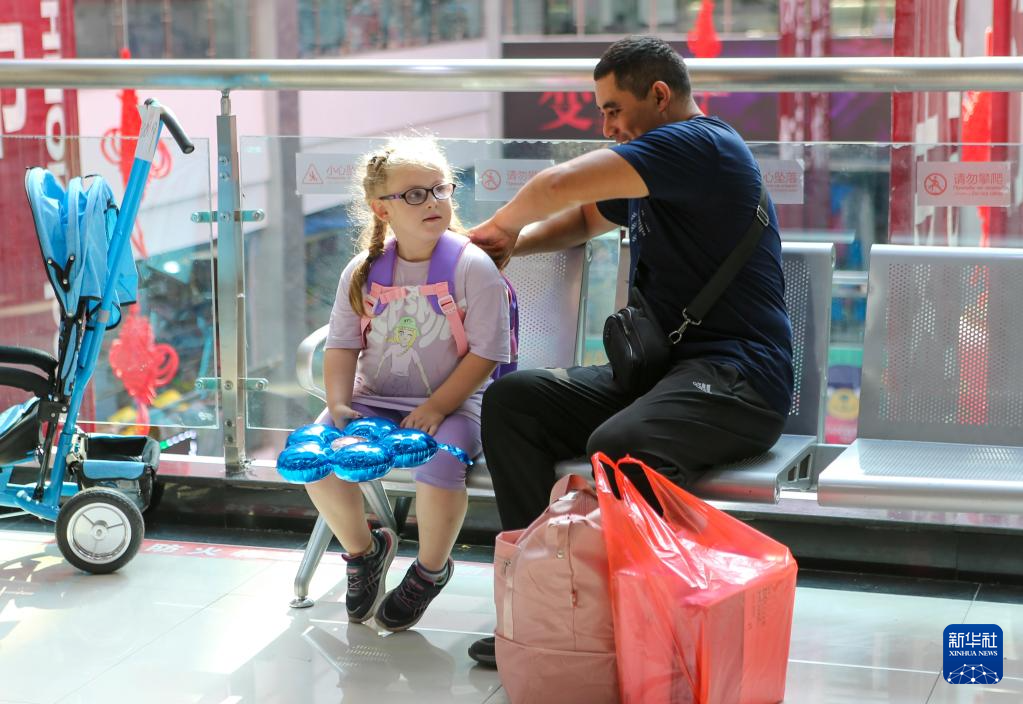 在中哈霍尔果斯国际边境合作中心,来自哈萨克斯坦的游客在购物后休息(7月26日摄)。