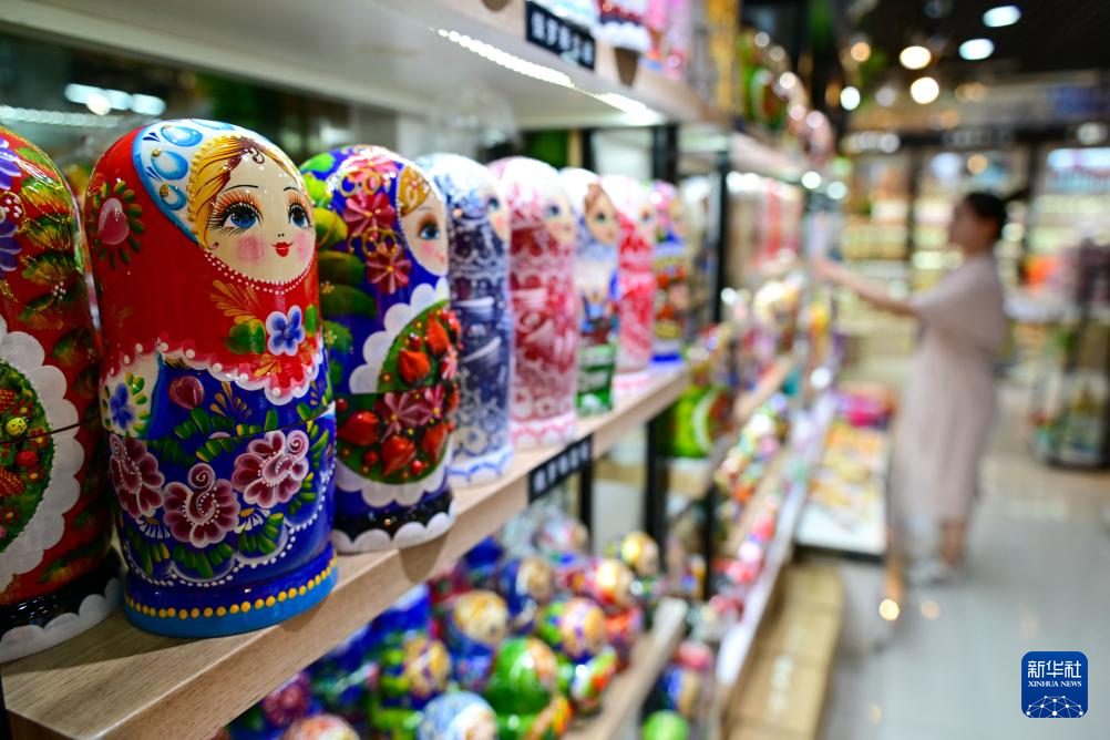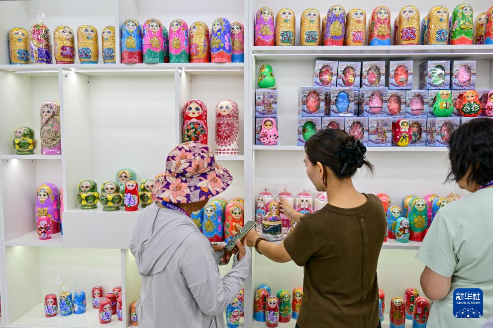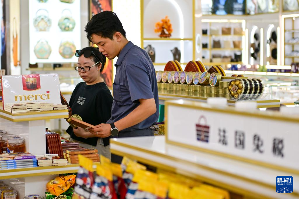 在中哈霍尔果斯国际边境合作中心,游客在免税店挑选商品(7月26日摄)。