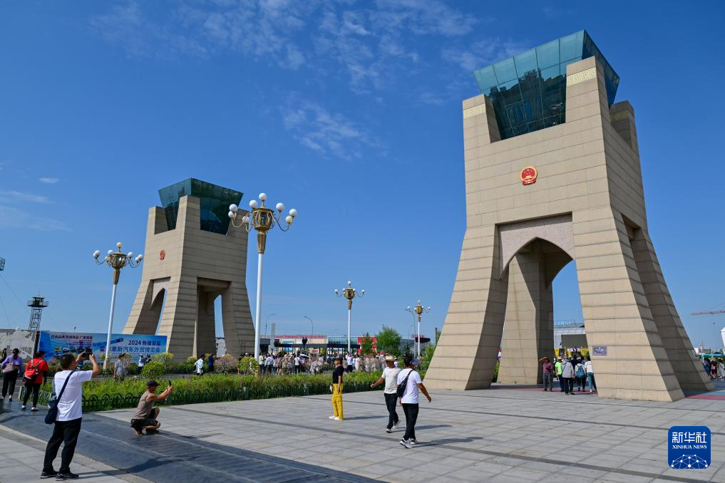游客在中哈霍尔果斯国际边境合作中心联检大楼门前拍照留念(7月26日摄)。