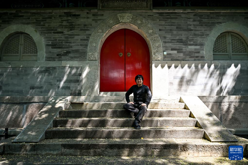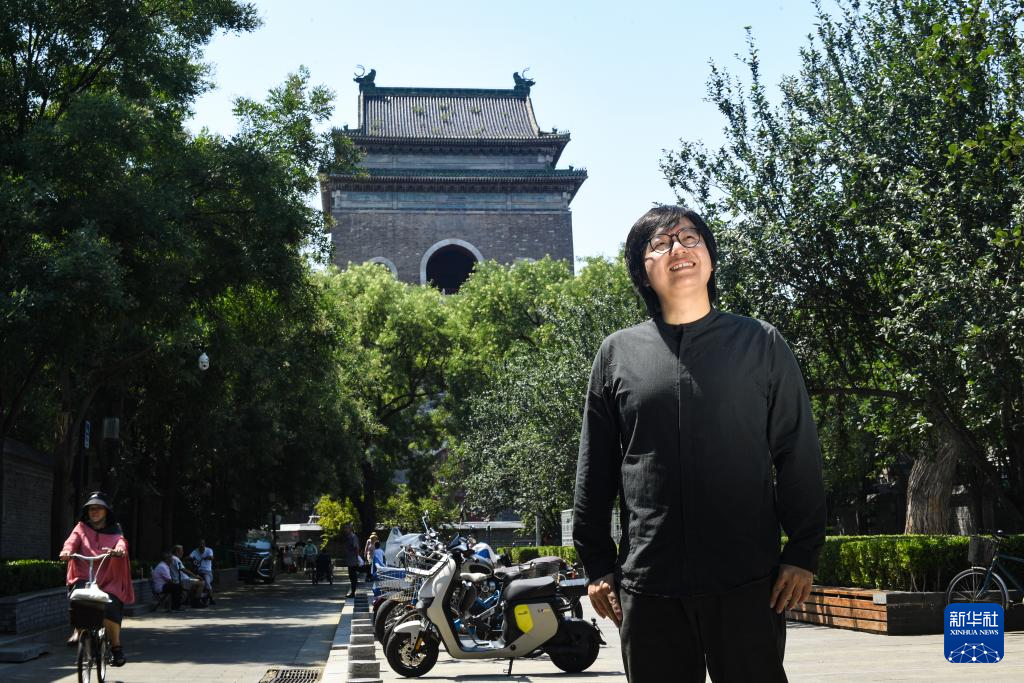 在钟楼北侧拍摄的朱起鹏(7月19日摄)。朱起鹏是《宏恩观:一座北京庙宇的故事》的策展人。2024年年初,位于钟楼北侧,完成腾退修缮的宏恩观开门迎客。常设展《宏恩观:一座北京庙宇的故事》用近百件展品,讲述这座始建于元代的古庙所经历的时空变迁。作为一名建筑师,朱起鹏曾主持设计过多处世界遗产项目的配建设施。2012年起,他把目光投向与北京中轴线相接的宏恩观,通过测绘复原、搜集老照片和物件,揭开这座庙宇被尘封的老故事。在他看来,北京中轴线申遗带动了老城整体性保护,不少像宏恩观这样的文物正一步步重获新生。