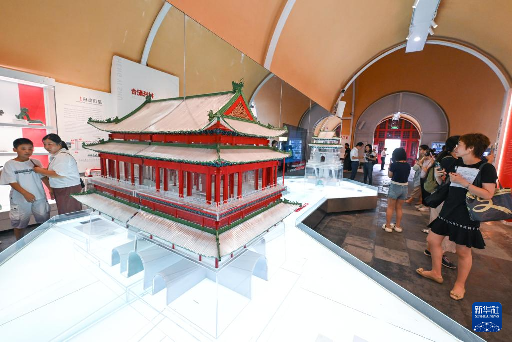 人们在鼓楼内观看鼓楼和钟楼模型(7月16日摄)。