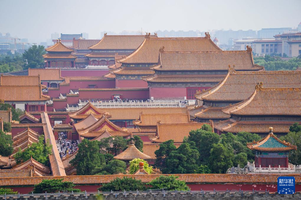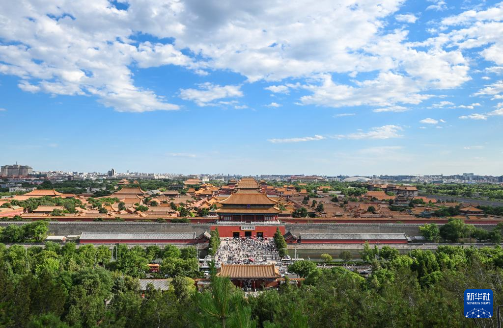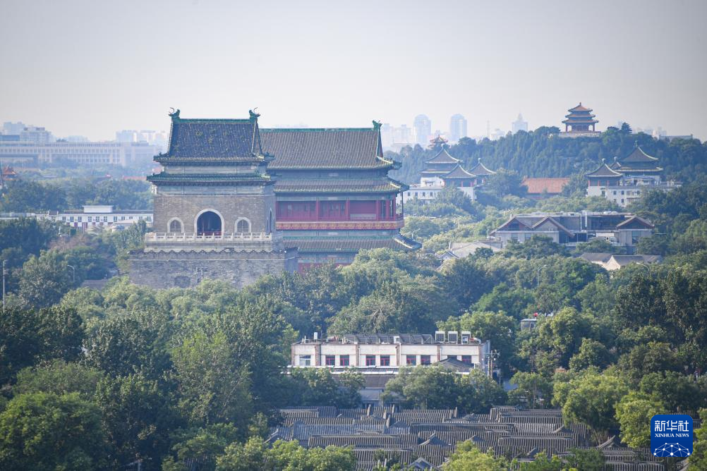 在鼓楼上拍摄的北京中轴线风光,远处是景山公园万春亭(6月2日摄)。