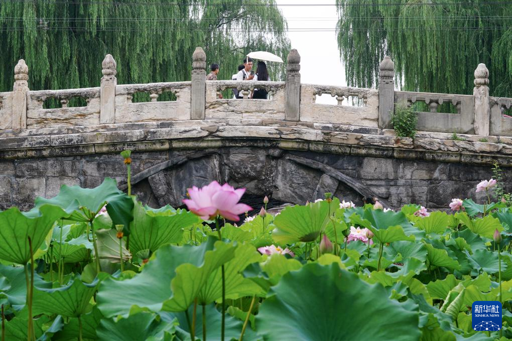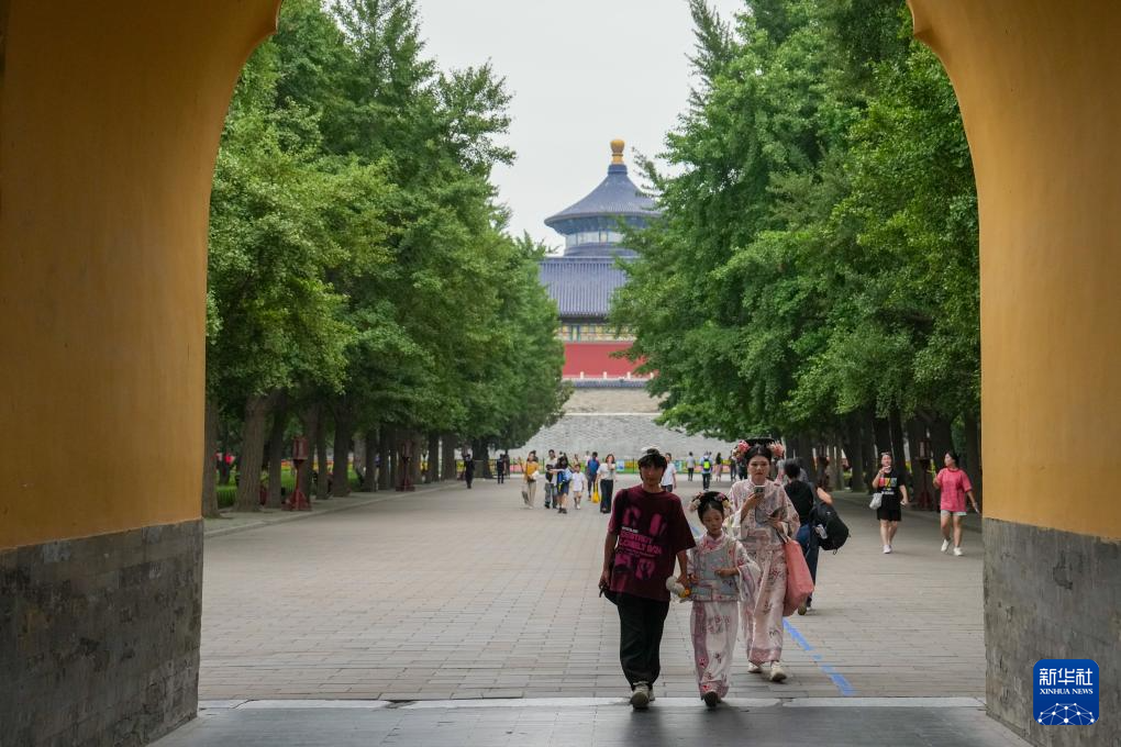 在北京永定门公园,游客在参观游览(7月18日摄)。