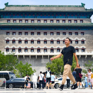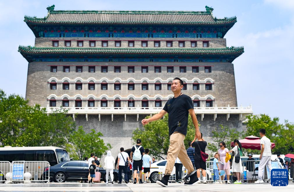 蔡文科穿着内联升布鞋行走在正阳门箭楼前(7月21日摄)。内联升、瑞蚨祥、稻香村、同仁堂……正阳门附近的大栅栏商业街,是老字号的聚集地,蕴藏在此的非遗技艺体现了北京中轴线上丰富的活态文化遗产。作为百年老店内联升手工布鞋技艺的传承人,蔡文科一边承袭前辈经验,一边研发创新,探索做出一双双融合传统文化与时代特点的手工布鞋。他希望,越来越多人可以穿上国潮布鞋,行走在北京中轴线上,感受多彩的中华文化。