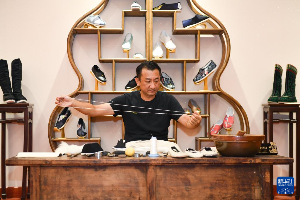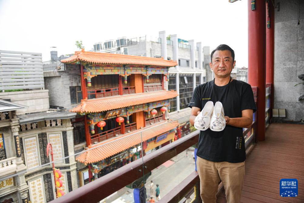 在位于大栅栏的内联升总店拍摄的蔡文科(7月21日摄)。内联升、瑞蚨祥、稻香村、同仁堂……正阳门附近的大栅栏商业街,是老字号的聚集地,蕴藏在此的非遗技艺体现了北京中轴线上丰富的活态文化遗产。作为百年老店内联升手工布鞋技艺的传承人,蔡文科一边承袭前辈经验,一边研发创新,探索做出一双双融合传统文化与时代特点的手工布鞋。他希望,越来越多人可以穿上国潮布鞋,行走在北京中轴线上,感受多彩的中华文化。