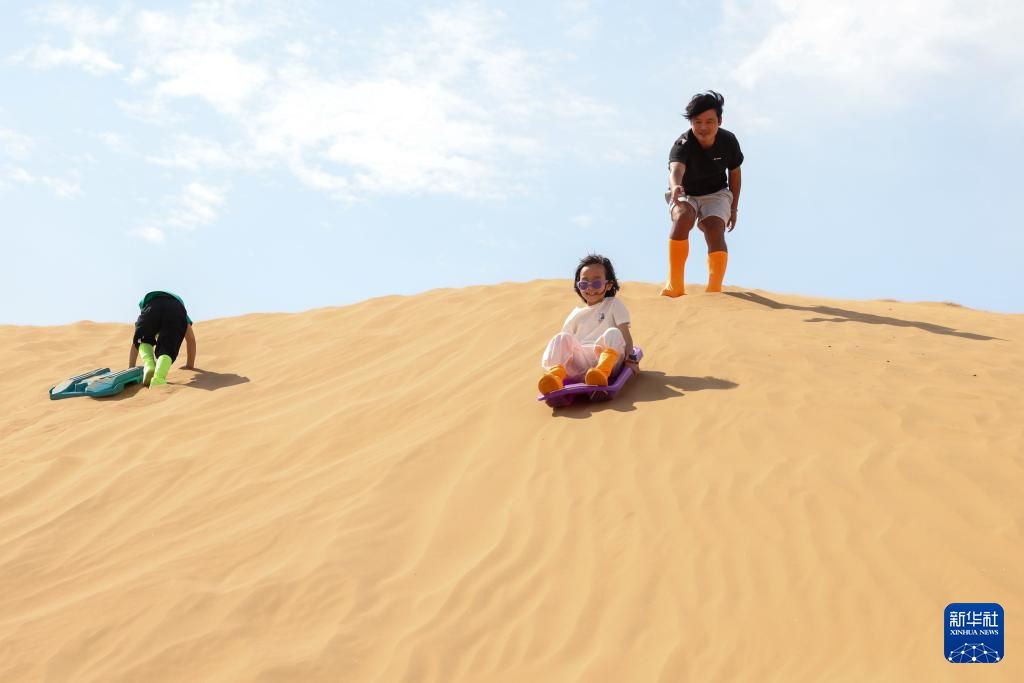 7月26日,游客在宁夏中卫市沙坡头景区滑沙。