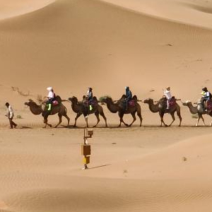 7月26日,游客在宁夏中卫市沙坡头景区体验骑骆驼。
