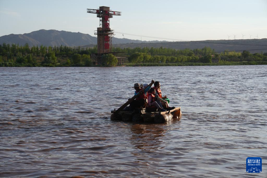 7月26日,在宁夏中卫市沙坡头旅游景区,游客坐在羊皮筏子上。