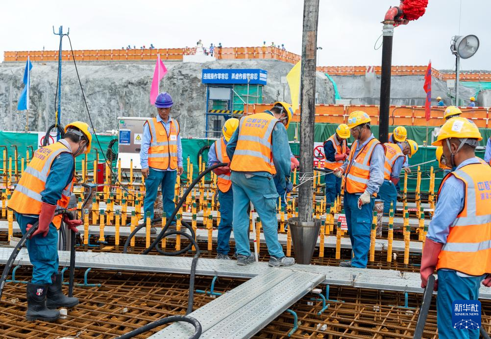 7月28日,施工人员在中广核宁德核电站5号机组施工现场浇筑混凝土。
