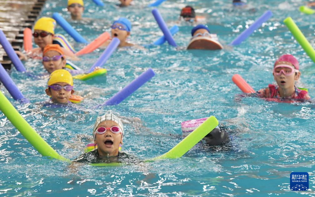 7月28日,孩子们在河北省石家庄新乐市一家游泳馆学习游泳。