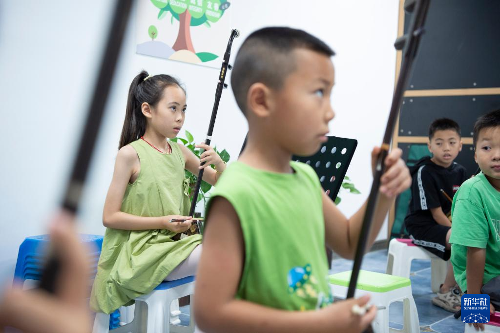 7月28日,在江苏省海安市,孩子们在学习传统乐器二胡的演奏。