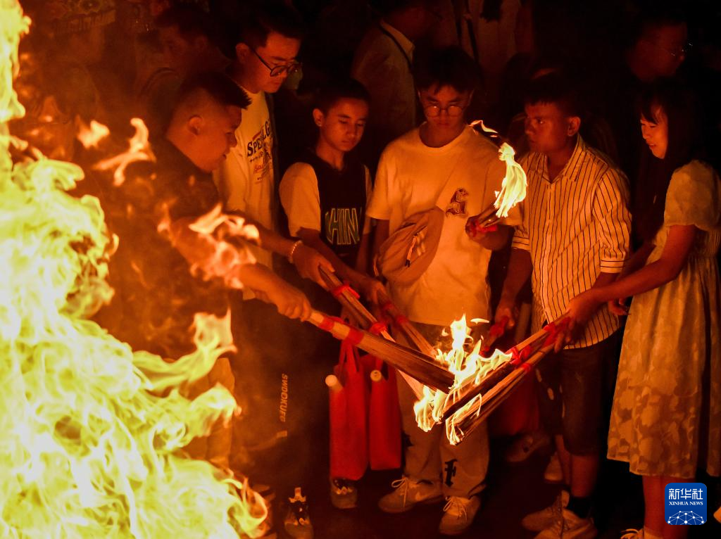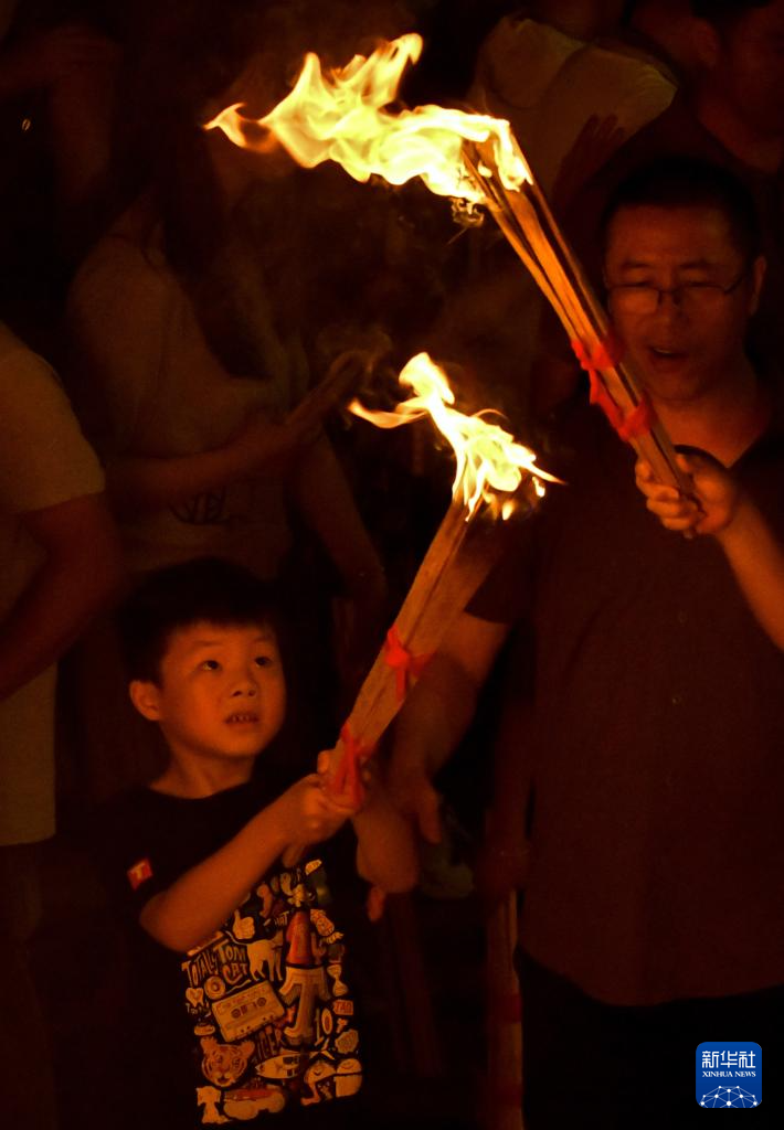 7月27日,人们在祭火大典上举起火把,欢庆火把节。