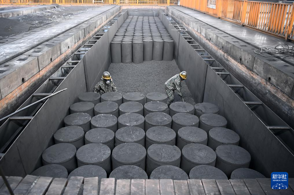 7月25日,在位于兰州新区的兰州宏彬新能源发展有限公司,工人在石墨化炉中作业。