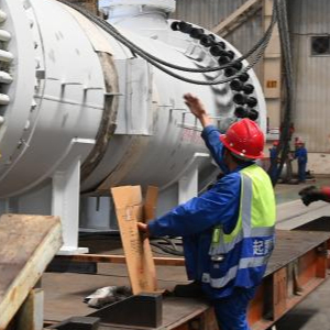 7月25日,在兰州新区兰石集团高端装备产业园,工人在吊装储罐设备。