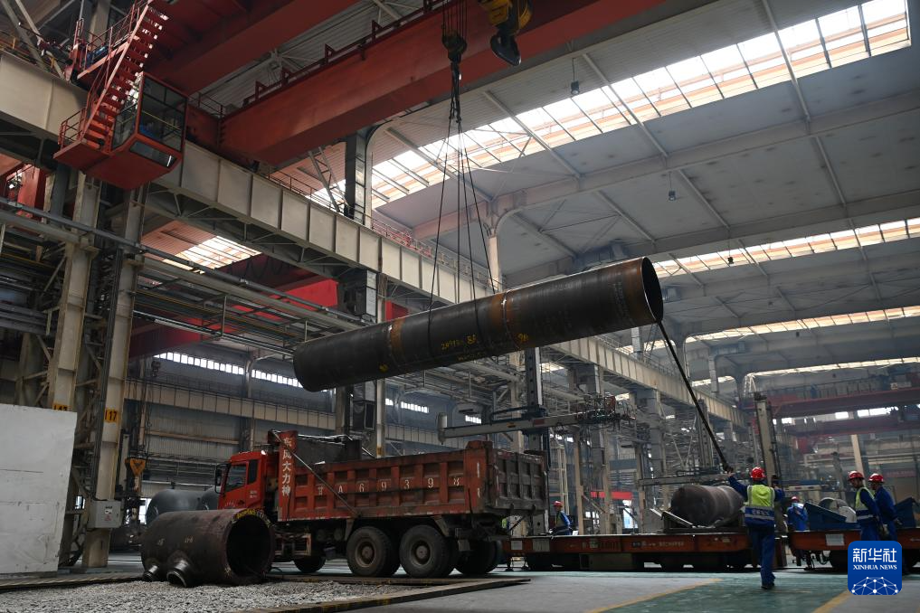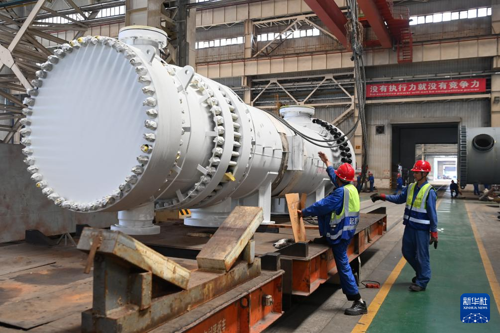 7月25日,在兰州新区兰石集团高端装备产业园,工人在吊装设备。
