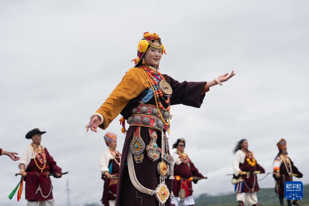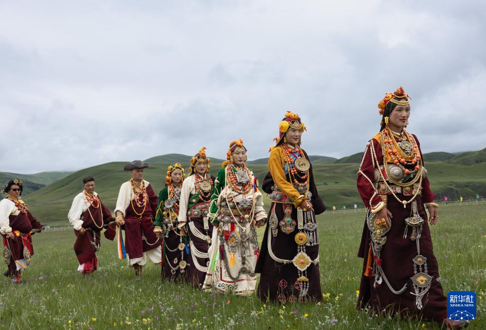 7月27日,在四川省白玉县日通草原上,当地藏族群众在展示传统服饰。