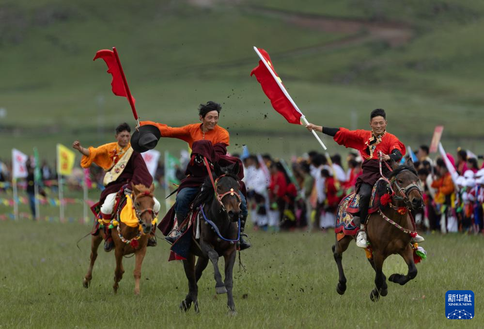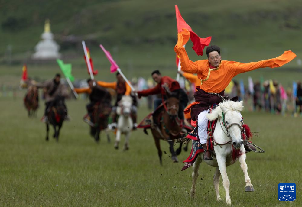 7月27日,在四川省白玉县日通草原上,当地群众在表演马术。