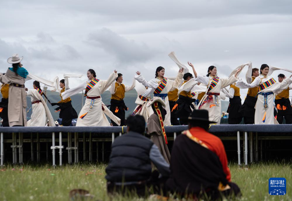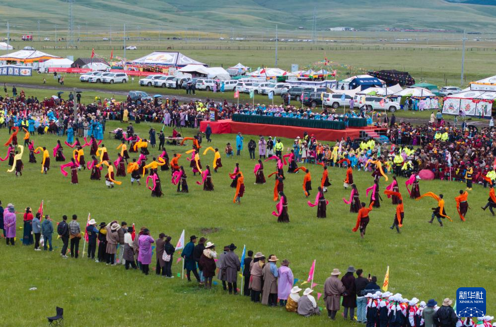 7月27日,在四川省白玉县日通草原上,来自白玉县各乡镇的群众进行锅庄表演。